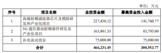 其中,高端射频滤波器芯片及模组研发和产业化项目总投资金额为22.74亿元,募集资金投入金额为14.18亿元。本项目将针对高性能、复杂应用的高端滤波器开展设计研发。通过与Foundry共同投入资源合作建立前道晶圆生产专线,将进一步深入拓展高端滤波器产品,覆盖低、中、高频段的各种应用场景,建立完整的射频滤波器产品线,产品将主要应用于移动智能终端设备。此次对于高端滤波器的研究开发,结合公司首次公开发行时的募投项目建设,可实现卓胜微滤波器产品线在移动智能终端领域的完整产业化布局。