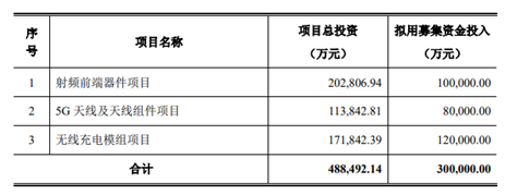 2020年7月3日,信维通信公告显示,募集资金总额不超过30亿元用于射频前端器件、5G天线及天线组件、无线充电模组三个项目。其中,射频前端器件项目总投资为20.28亿元,拟用募集资金10亿元。项目建成后,信维通信将在现有5G天线业务基础之上,向SAW、TC-SAW和BAW等射频前端产品方向延伸,进一步提升公司在主营业务领域的整体竞争力。