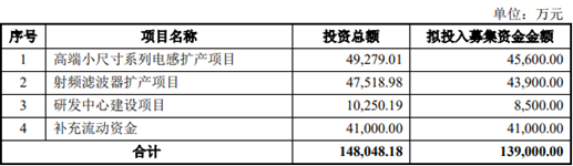 今年9月3日,麦捷科技非公开发行募集资金不超过人民币13.90亿元用于高端小尺寸系列电感扩产、射频滤波器扩产、研发中心建设项目及补充流动资金。其中,射频滤波器扩产项目投资总额为4.75亿元。项目设计产能为年产LTCC 射频元器件11亿只、SAW 滤波器14亿只,项目全部达产后,预计可实现年产值6.61亿元。