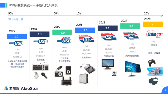 USB全称是Universal Serial Bus,名称体现了其通用性强、传输率高、兼容性好和即插即用的初心。迄今,USB接口标准已经历了3个阶段。第一阶段始于1995年,为解决接口通用性问题,第一代USB标准问世,传输速度仅为1.5Mbps,业内反响平平。第二阶段自2000年始,USB 2.0传输速度达到480Mbps,被广泛应用于各种数据传输应用。但在随后5年多间,USB标准并无新的亮点。