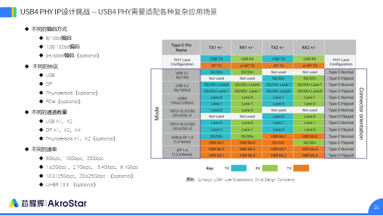 如图,为支持不同的编码,包括8/10bit,128/132bit,还有可选的64/66bit;不同的协议,USB、DP,以及可选的Thunderbolt、PCIe等,以及繁多的传输速率和协议电气特性等。IP设计上需要通盘考虑、逐个优化。