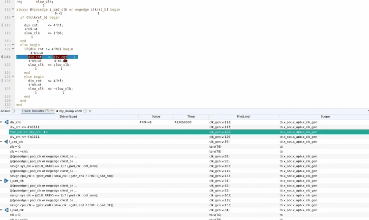 Fusion Debug™提供了信号值变化根本原因分析技术(root cause analysis),支持选取同一个信号在不同时间点的变化做根本原因分析,并能正确定位Root Cause的位置。同时可以在电路图里做Active Trace,将信号变化的传播轨迹展示出来。