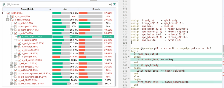 芯华章的Coverage数据具有统一的数据格式,不同的产品都可以通过Coverage DB的接口产生覆盖率数据。通过界面中覆盖率数据面板,可查看统计数据、摘要和详细信息。同时,Coverage视图直接集成在Fusion Debug™产品内部,能够与Fusion Debug™其他视图无缝连接,用户查看Coverage的同时就能直接Debug。