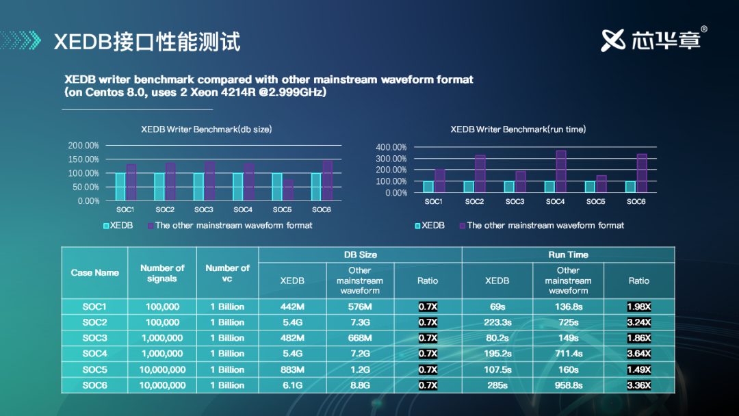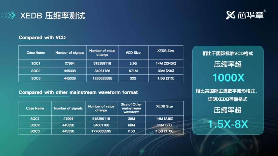 通过3个不同的SoC进行XEDB的压缩率测试。测试过程中,通过使不同格式的输入内容是相同的(信号数量和数值变化数量相同),来对比输出波形的大小,测试数据如下: