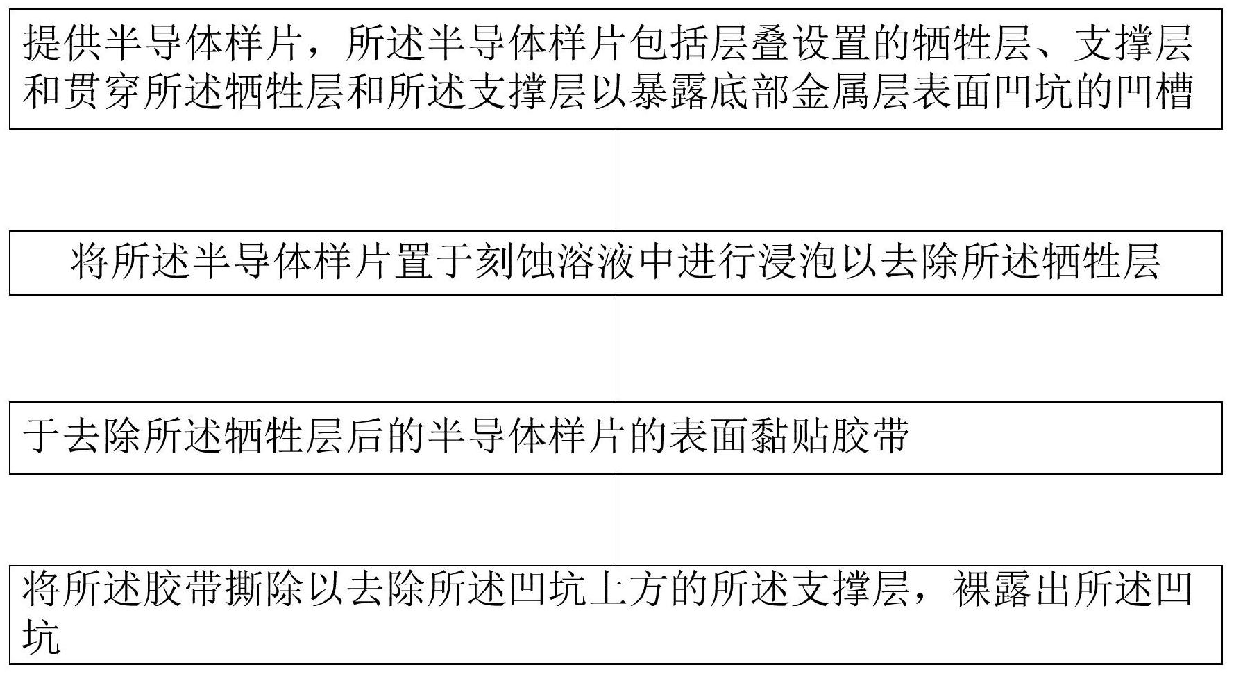 专利摘要显示,该发明公开了一种用于显微镜的刻蚀凹坑半导体样品的制备方法,包括提供半导体样片,所述半导体样片包括层叠设置的牺牲层、支撑层和贯穿所述牺牲层和所述支撑层以暴露底部金属层表面凹坑的凹槽;将所述半导体样片置于刻蚀溶液中进行浸泡以去除所述牺牲层;于去除所述牺牲层后的半导体样片的表面黏贴胶带;将所述胶带撕除以去除所述凹坑上方的所述支撑层,裸露出所述凹坑。