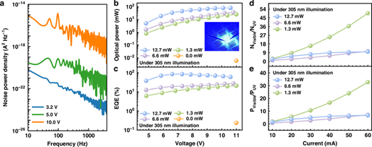 图2(见原文Fig. 5):(a)不同正向偏压下的噪声功率密度;(b)不同紫外光功率下Mini-LED的光功率随偏压的变化;(c)不同紫外光功率下Mini-LED的外量子效率随偏压的变化;(d)可见光与紫外光光子数比随注入电流的变化;(e)可见光与紫外光功率转换效率随注入电流的变化。