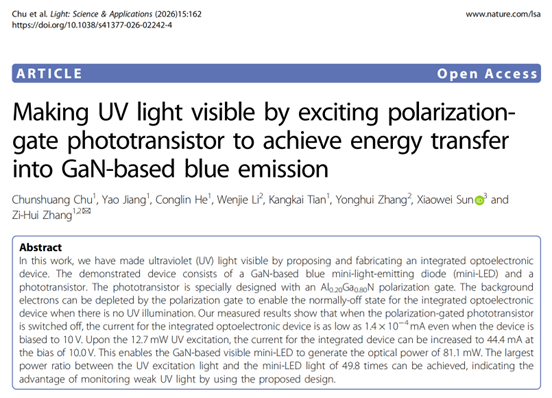 近日,我院张紫辉教授团队在实现紫外光到蓝光的可视化预警研究领域取得重要进展。相关研究论文以“Making UV light visible by exciting polarization-gate phototransistor to achieve energy transfer into GaN-based blue emission”为题,发表于光学领域的国际顶级期刊《Light: Science & Applications》(影响因子:23.4,中科院一区TOP期刊)。