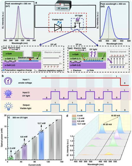 图1(见原文Fig. 2):(a)等效电路图及工作机理:(a1)305 nm的紫外光和(a2)Mini-LED产生的460 nm可见光的EL光谱;(a3)无305 nm紫外光激发时光晶体管关闭;(a4)有紫外光激发时光晶体管开启;(b)输入偏压、外部紫外光信号与可见光信号的逻辑关系示意图;(c)紫外激发光源的光功率随注入电流的变化关系;(d)不同紫外光功率下Mini-LED的电致发光光谱。