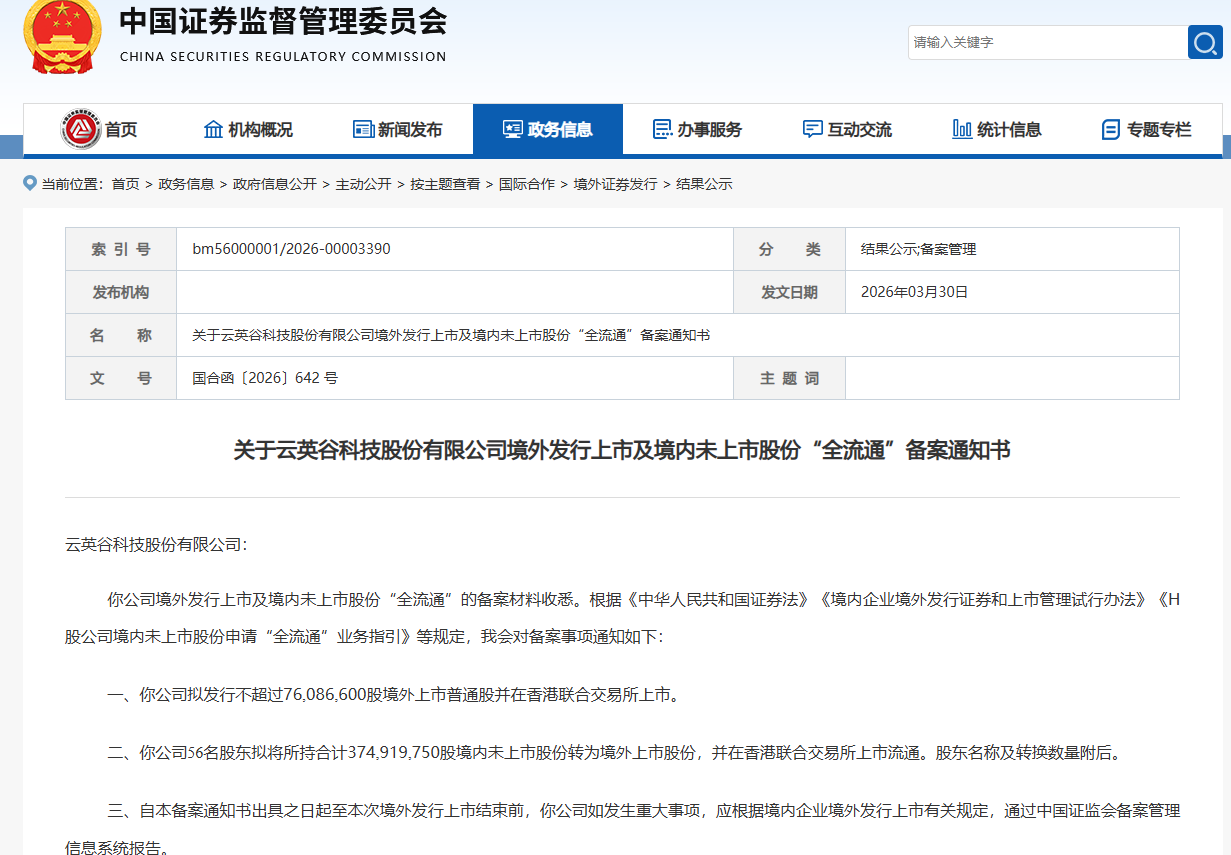 3月30日,中国证监会发布《关于云英谷科技股份有限公司境外发行上市及境内未上市股份“全流通”备案通知书》,云英谷科技股份有限公司境外发行上市及境内未上市股份“全流通”正式获批。