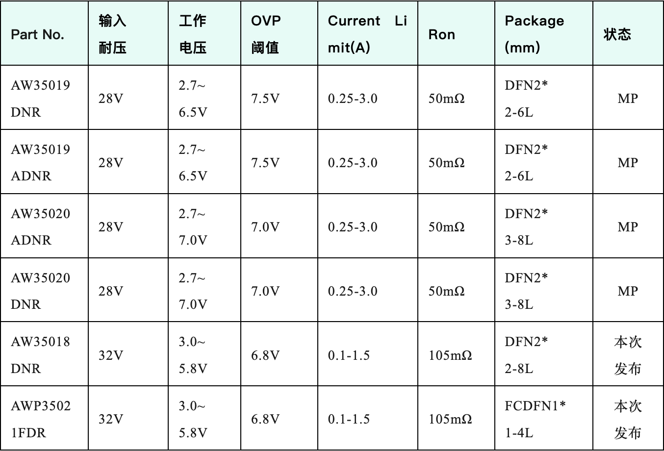 表3 艾为产品选型表