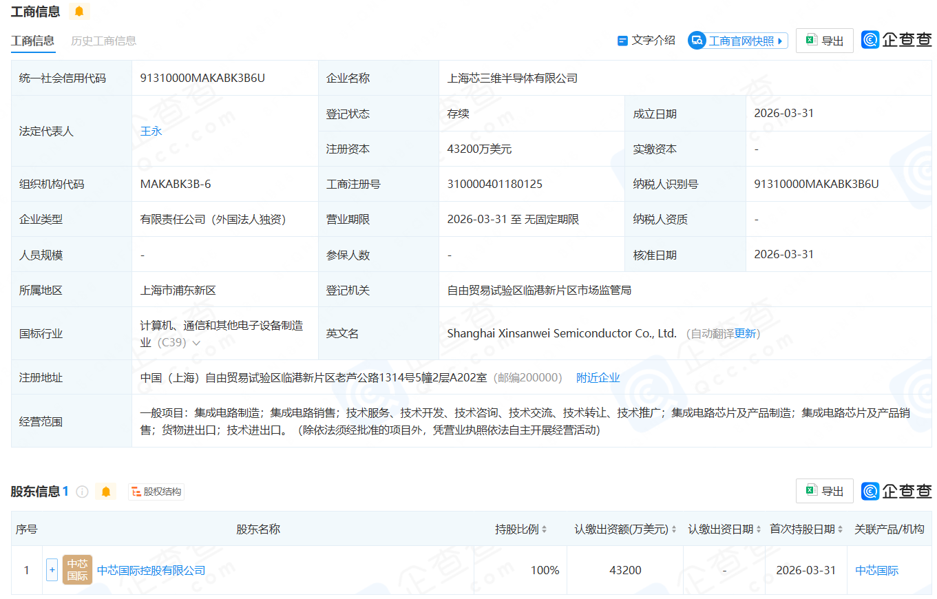 企查查公开信息显示,3月31日,上海芯三维半导体有限公司成立,法定代表人为王永,注册资本4.32亿美元(约29.75亿人民币),经营范围包括集成电路制造;集成电路销售;技术服务、技术开发、技术咨询、技术交流、技术转让、技术推广;集成电路芯片及产品制造;集成电路芯片及产品销售;货物进出口;技术进出口。