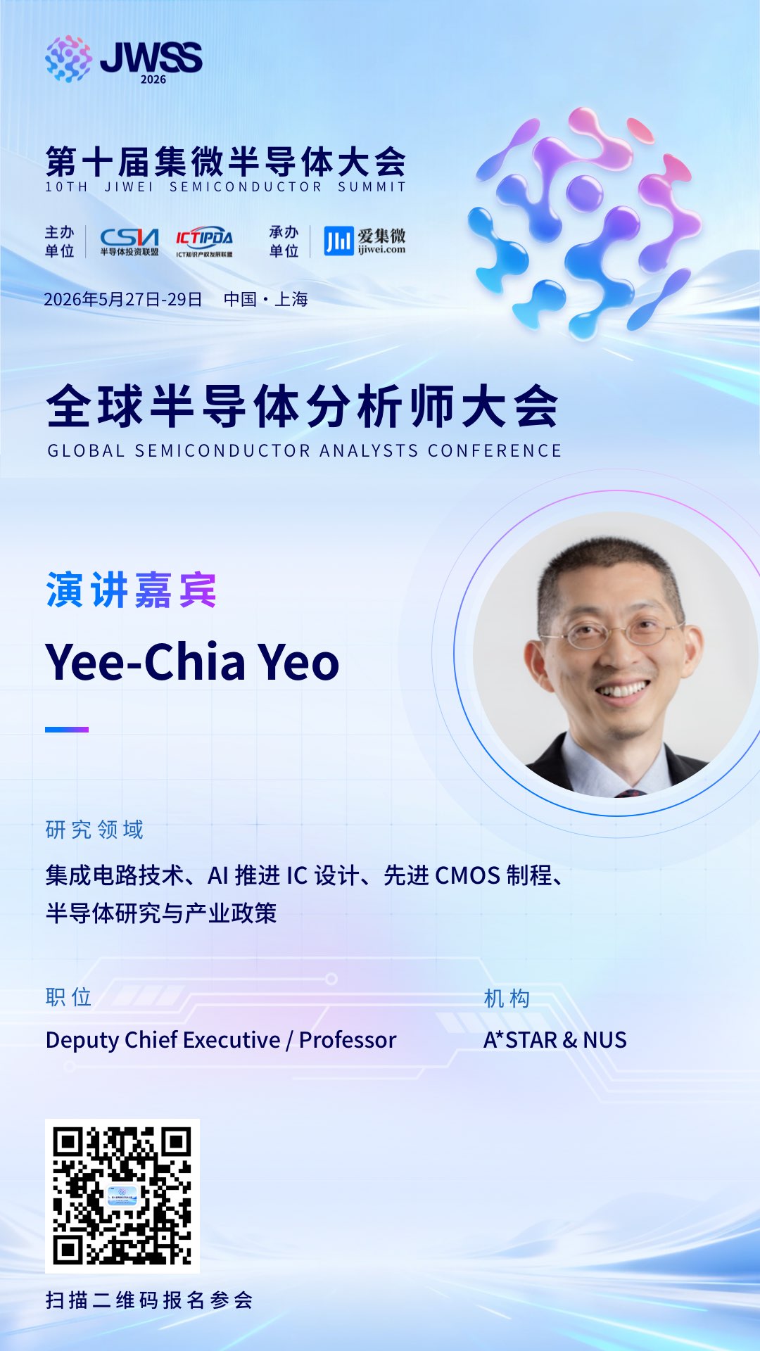 我们非常荣幸地宣布,新加坡科技研究局(A*STAR)副执行长、新加坡国立大学(NUS)教授Yee-Chia Yeo将重磅出席本次大会,并带来题为《如何以人工智能推进集成电路(IC)发展》的专业分享。