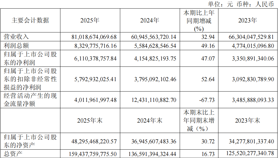 2025年,华友钴业实现营业收入810.19亿元,同比增长32.94%;归属于上市公司股东的净利润达到61.1亿元,同比大幅增长47.07%,创造了公司成立以来的最好业绩。扣除非经常性损益后的净利润为57.93亿元,同比增长52.64%。基本每股收益为3.34元,同比增长33.6%。公司加权平均净资产收益率提升至13.7%,显示出强劲的盈利能力和经营效率。