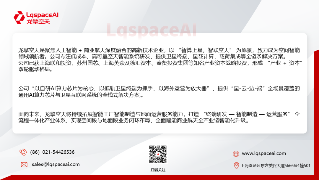 未来,龙擎空天将以技术创新为核心,深化与产业链上下游的协同合作,持续加快星上智能平台的研发与低轨卫星终端的量产落地,全力提速海内外市场布局,以硬核科技助力商业航天产业高质量发展。