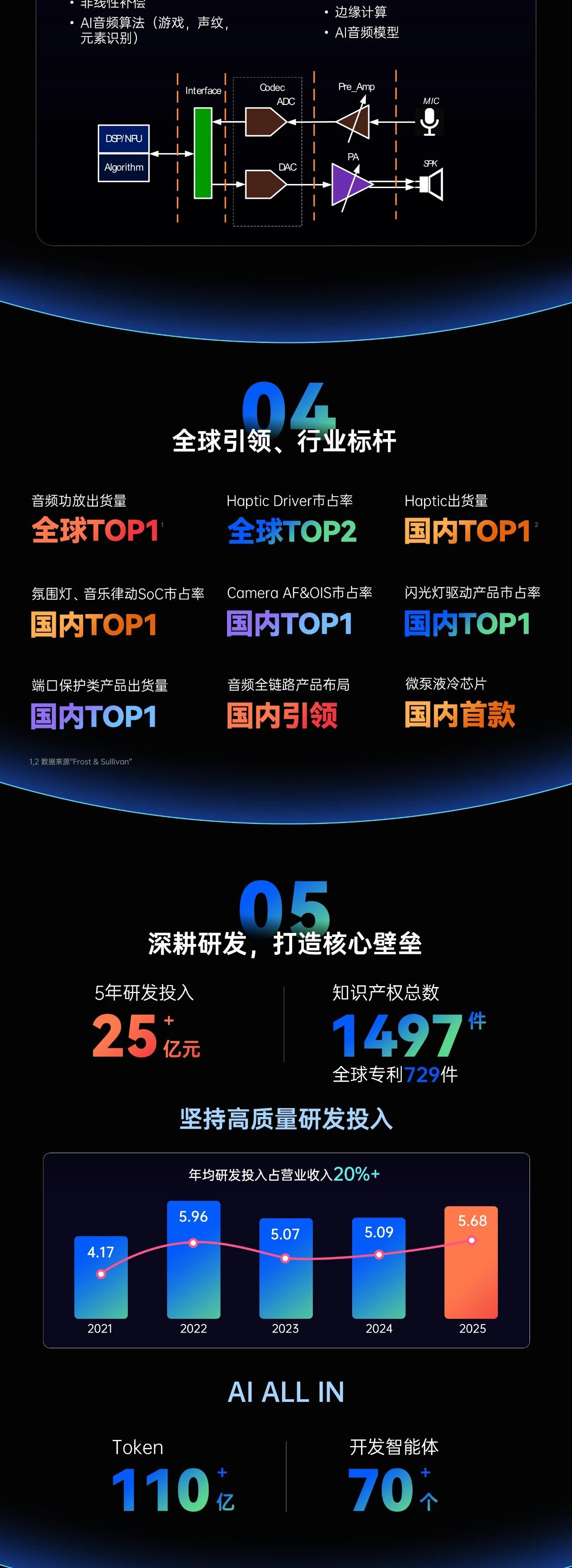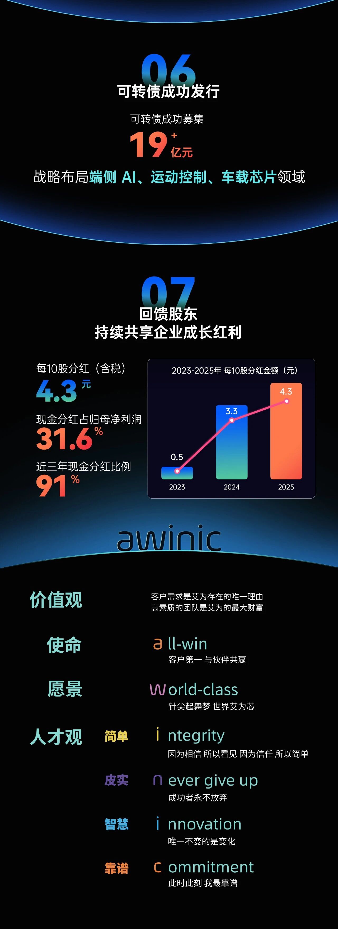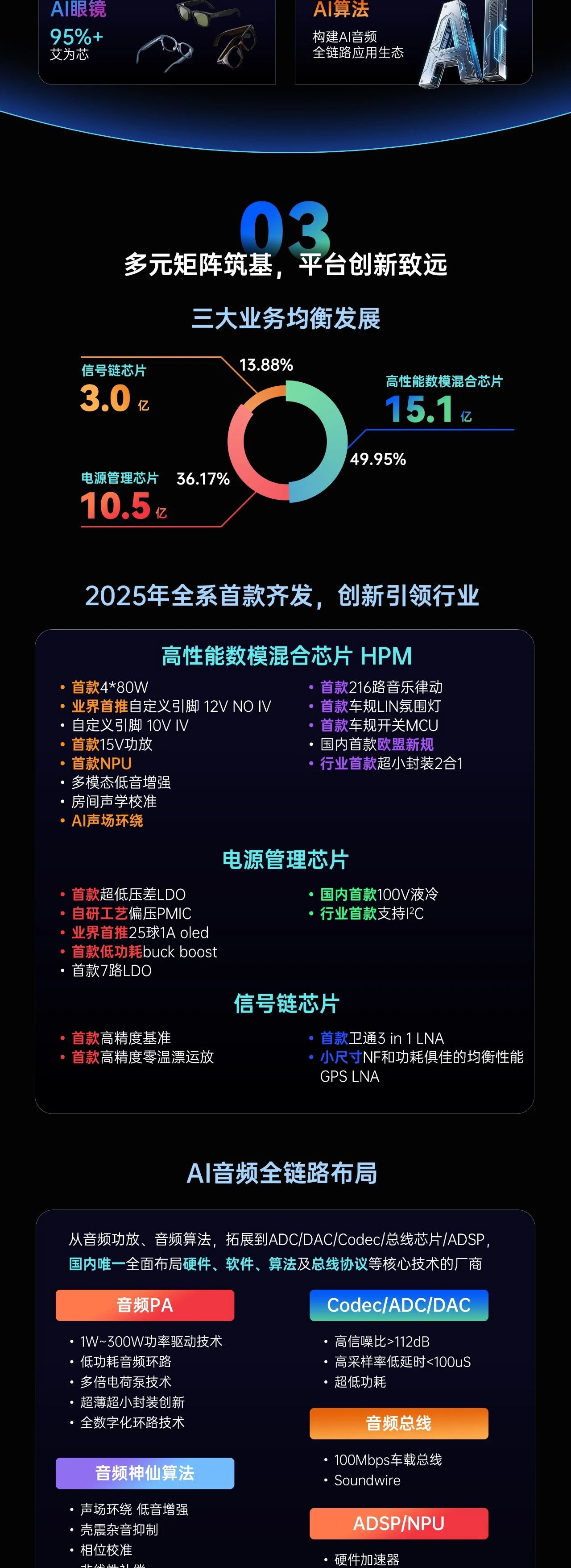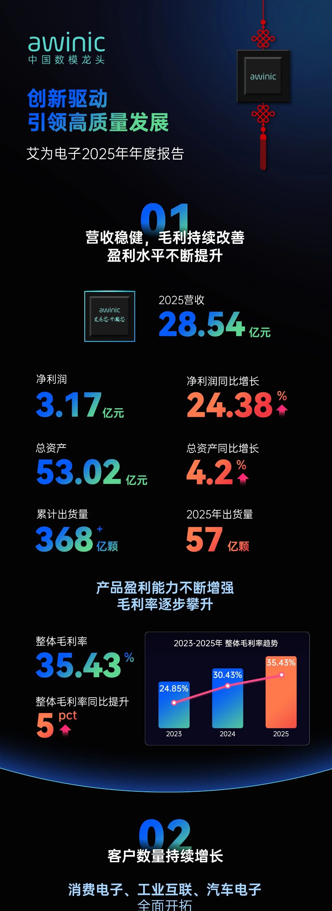 一张图了解艾为电子2025年亮点数据 作者: 爱集微 2小时前 相关舆情 AI解读 生成海报 来源:艾为电子 #艾为电子# #2025年年报# 评论 收藏 点赞 1304 责编: 爱集微 来源:艾为电子 #艾为电子# #2025年年报# 收藏 点赞 分享至: 微信扫一扫分享 THE END 相关推荐 长电科技发布2025年年报:全年营收创历史新高,利润总额同比增长 艾为电子出台募集资金管理制度,保障投资者利益 艾为电子2025年审计委员会履职尽责,2026年将持续护航公司规范运作 艾为电子2025年财务报告内部控制有效,展现良好内控水平 艾为电子优化核心技术人员构成,持续提升创新能力 艾为电子7577.74万元募投项目节余资金永久补充流动资金 +关注 爱集微 微信: 邮箱:laoyaoba@gmail.com 13w文章总数 12012.5w总浏览量 最近发布 昂瑞微5G射频前端通过车规认证,为智能网联车辆通信提供可靠保障 40分钟前 院士领衔鉴定|维信诺召开ViP技术成果研讨鉴定会,宣布品牌客户量产出货 44分钟前 日月光今年6座新厂动工,拟上调资本支出 1小时前 英特尔任命Santhosh Viswanathan为亚太及日本区副总裁暨总经理 1小时前 传三星2nm良率下滑“稳定性成隐忧”!高通考虑转单台积电 1小时前 获取更多内容 最新资讯 华峰铝业30亿投建55万吨高端铝板带箔项目 21分钟前 锴威特2025年实现营收2.55亿元,同比增长95.62% 31分钟前 杭氧股份2025年营收突破150亿 新兴赛道布局加速 34分钟前 昂瑞微5G射频前端通过车规认证,为智能网联车辆通信提供可靠保障 40分钟前 院士领衔鉴定|维信诺召开ViP技术成果研讨鉴定会,宣布品牌客户量产出货 44分钟前 盛合晶微195倍市盈率申购落地,A股封测板块股价冰火两重天 7小时前