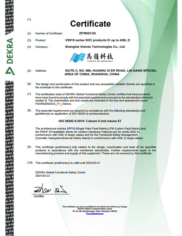 为旌VS919系列车规芯片,全面遵循ISO 26262 功能安全与AEC-Q100 车规级标准,构建从设计、验证到量产的全流程质量体系,确保芯片在 - 40℃至 125℃的极端环境下稳定运行,满足车载场景零失效的可靠性诉求。