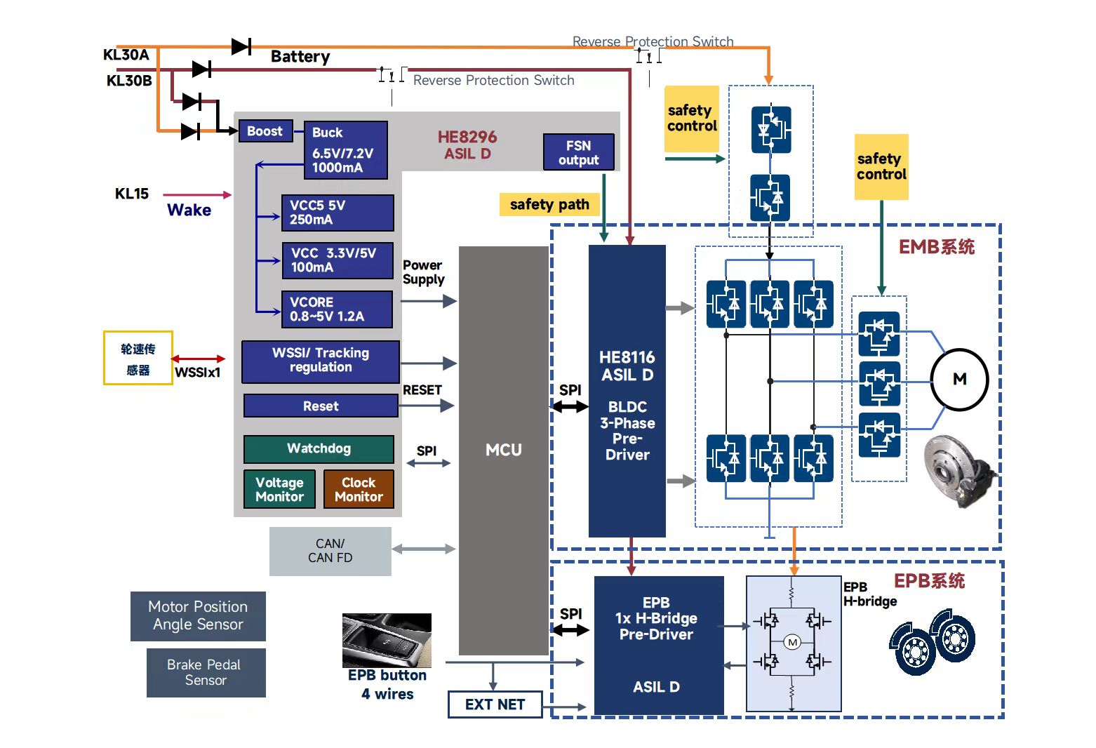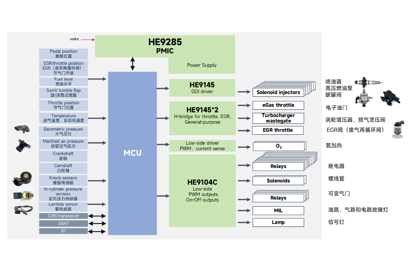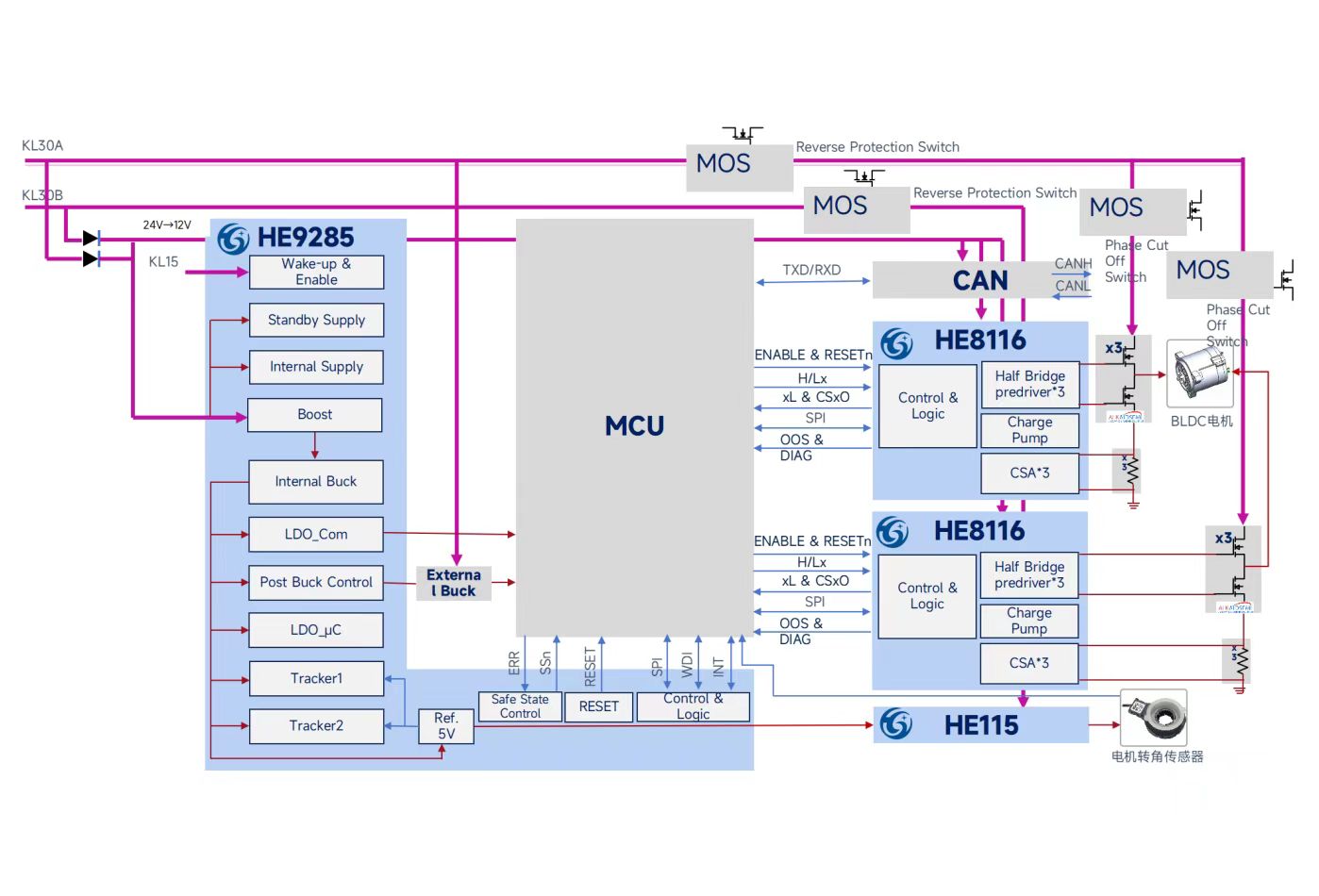 现有产品中,公司已量产或送样兼容12V(乘用车)与24V(商用车)系统的8通道可配置高低边预驱芯片HE9145、高功能安全三相无刷直流电机预驱动芯片HE8116等多款重点产品,提供柴油多缸引擎管理(EMS)、电动助力转向(EPS)、电子制动控制(EMB)等国产化应用方案。