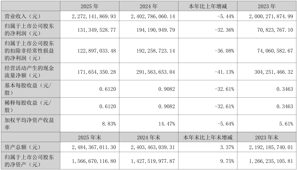 4月13日,安利股份发布2025年年度报告。报告显示,2025年公司实现营业收入22.72亿元,同比下降5.44%;实现归属于上市公司股东的净利润1.31亿元,同比下降32.36%;扣非净利润1.23亿元,同比下降36.08%。业绩变动主要受外部宏观环境影响,导致产销量短期减少,同时公司因实施第四期员工持股计划计提股份支付费用约3069万元,以及保持高强度研发投入所致。