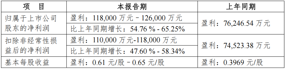 扣除非经常性损益后的净利润预计为盈利11.0亿元至11.8亿元,较上年同期的7.45亿元增长47.60%至58.34%。基本每股收益预计为0.61元/股至0.65元/股,上年同期为0.3969元/股。