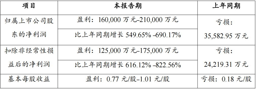 扣除非经常性损益后的净利润预计为125,000万元至175,000万元,较上年同期亏损24,219.31万元增长616.12%至822.56%;基本每股收益预计为0.77元至1.01元,上年同期为亏损0.18元。