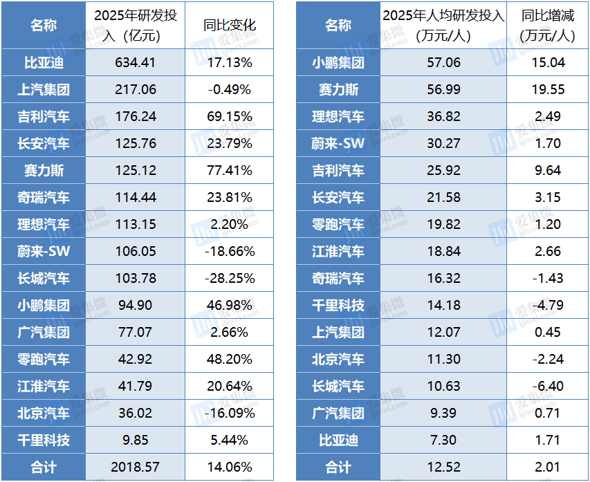 2024至2025年,16家车企研发投入总额从约1769.73亿元增长至2018.57亿元,同比增长14.06%,研发投入强度显著提升。同时,人均研发投入(研发投入/员工总数)成为衡量企业创新效率的重要指标,企业间差异显著。