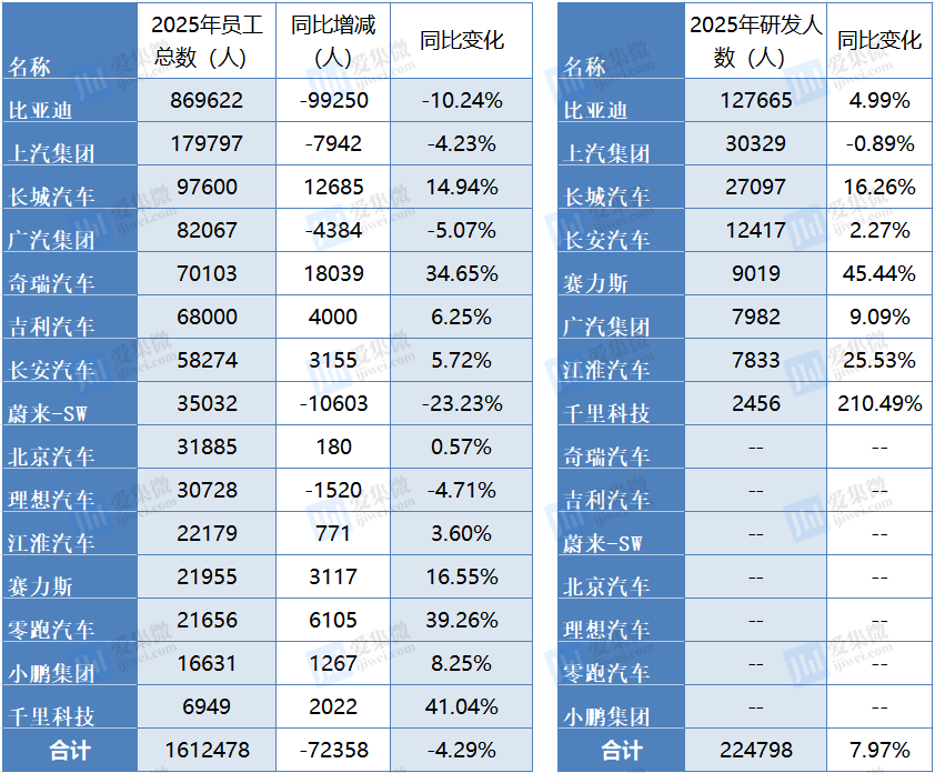 减员不减研:中国上市车企2025年员工数量谁在收缩谁在加码?