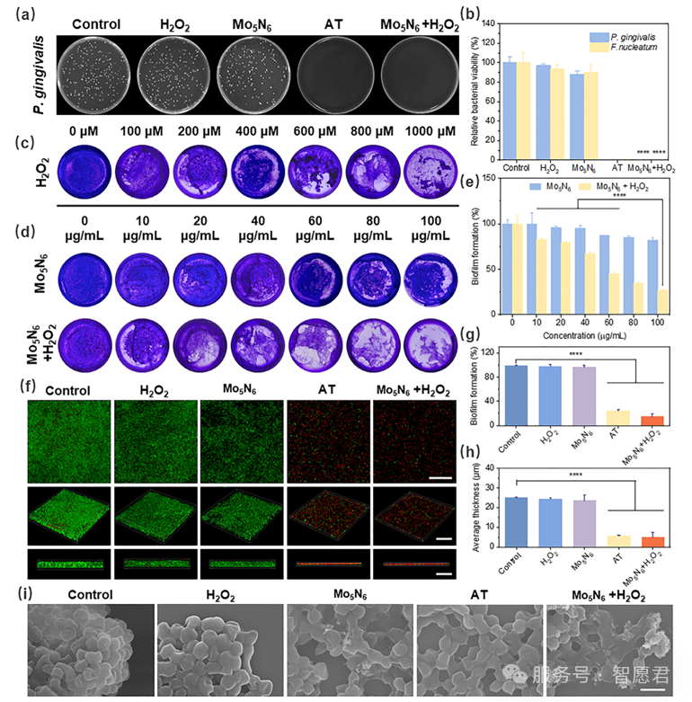 图 3. Mo₅N₆对牙龈卟啉单胞菌(Pg)的体外抗菌性能评价。五组牙龈卟啉单胞菌的对比结果如下:未处理对照组(Control)、仅经 200 μM 过氧化氢(H₂O₂)或 100 μg/mL Mo₅N₆处理组(Mo₅N₆)、3% 过氧化氢处理组(阳性处理组,AT)以及 100 μg/mL Mo₅N₆与 200 μM 过氧化氢联合处理组(Mo₅N₆+H₂O₂)。(a) 牙龈卟啉单胞菌形成的菌落照片。(b) 采用平板计数法测定的牙龈卟啉单胞菌相对存活率。(c) 经不同浓度过氧化氢处理后细菌生物膜的结晶紫染色图像。(d) 在有无过氧化氢处理条件下,不同材料浓度作用下牙龈卟啉单胞菌生物膜的结晶紫染色图像。(e) 通过结晶紫染色在 595 nm 光密度(OD₅₉₅)下定量牙龈卟啉单胞菌生物膜的生物量。(f) 不同处理后牙龈卟啉单胞菌生物膜的三维共聚焦激光扫描显微镜(CLSM)活 / 死染色图像(标尺:50 μm)。(g) 图 (f) 中生物膜生物量及 (h) 平均厚度的统计学分析。