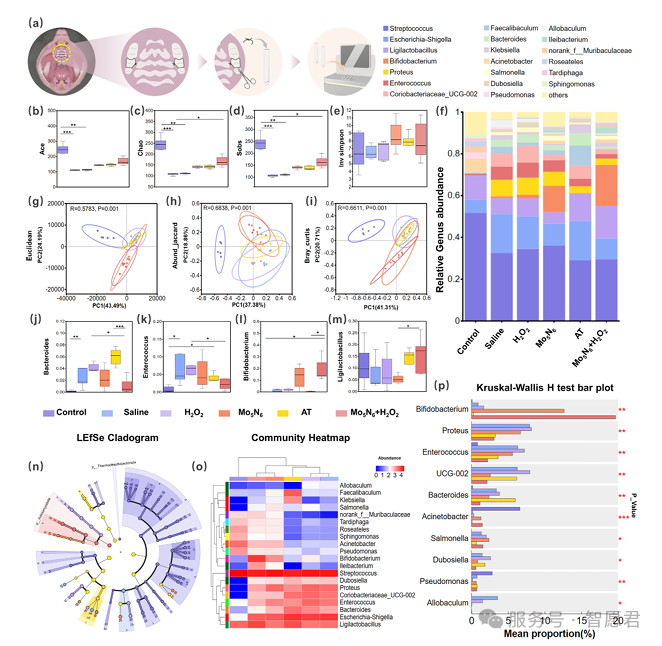 图 5. Mo5 N6 处理对龈下微生物群落结构的调控作用。(a) 牙周微生物组 16S rDNA 分析的取样流程示意图。(b–e) 通过 Ace、Chao、Sobs 和 Inv simpson 分析对龈下微生物组进行 α 多样性分析(每组 n=5,Wilcoxon 秩和检验)。(f) 各组在属水平上龈下微生物群落相对丰度的堆叠箱线图。分别采用 (g) 欧氏距离、(h) 丰度‑贾卡德距离和 (i) 布雷‑柯蒂斯相异度进行主坐标分析(PCoA),以评估 β 多样性并可视化处理诱导的微生物群落结构变化(每组 n=5,PERMANOVA 检验)。(j–m) 牙周区域中 (j) 拟杆菌属、(k) 肠球菌属、(l) 双歧杆菌属和 (m) 敏捷乳杆菌属的相对丰度分析(每组 n=5,Wilcoxon 秩和检验)。(n) 采用 LEfSe 分析展示不同组中优势菌(门至属水平),LDA 值>2。各节点的直径与颜色表示其在对应组中的富集程度。(o) 热图展示 20 种优势菌在不同样本中的相对丰度分布(属水平),横坐标为组别名称,纵坐标为科水平细菌分类学信息。不同颜色梯度(从蓝色至红色)表示相对丰度大小。顶部与左侧的聚类树状图反映丰度模式的相似性关系。(p) 各类微生物丰度比较(每组 n=5,Wilcoxon 秩和检验)。数据以 n=5 的平均值 ± 标准差表示。ns:无显著性差异,*p<0.05,p<0.01,*p<0.001,p<0.0001。