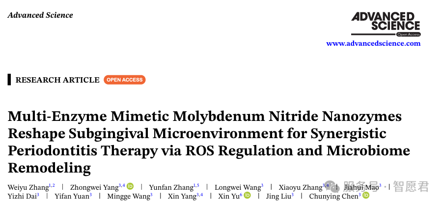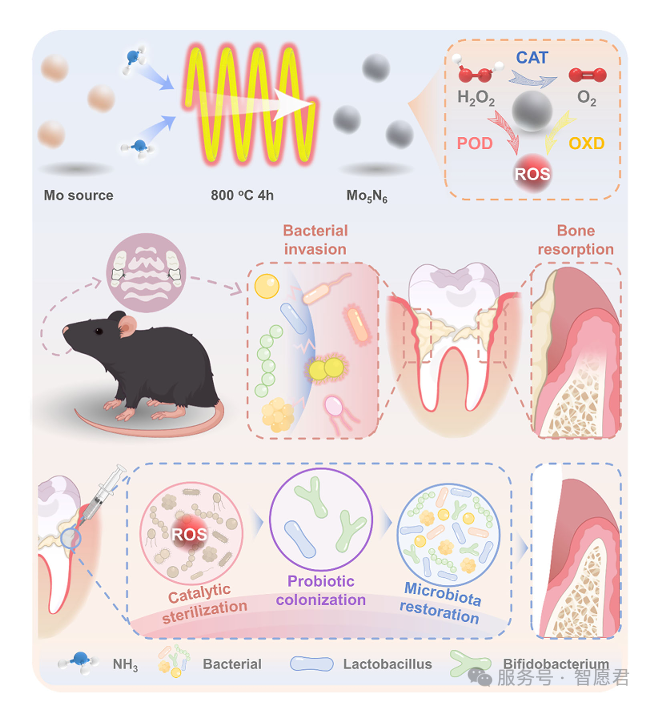 最近,北京大学和济南大学在《ADVANCED SCIENCE》期刊发表了多酶模拟氮化钼纳米酶通过活性氧调控与微生物组重塑重塑龈下微环境用于协同牙周炎治疗。牙周炎是由菌斑微生物与宿主免疫反应引发的慢性炎症,是全球失牙主要原因。传统机械清创与抗生素、消毒剂辅助治疗因牙周解剖结构复杂、耐药性、龈下渗透与滞留差等问题疗效有限。本研究设计了一种具有过氧化物酶、氧化酶、过氧化氢酶三重模拟酶活性的 Mo-N 配位纳米酶(Mo₅N₆)。依托 Mo-N 配位与多酶模拟特性,该纳米酶可动态调控龈沟内局部氧化反应,在有效杀伤致病菌的同时避免过度氧化应激;高效清除对活性氧(ROS)敏感的厌氧革兰氏阴性牙周致病菌,减轻致病刺激。该策略不仅改善牙周微环境,还能促进共生菌群恢复与牙周组织再生,证实Mo₅N₆纳米酶在牙周炎治疗中具有重要应用潜力。