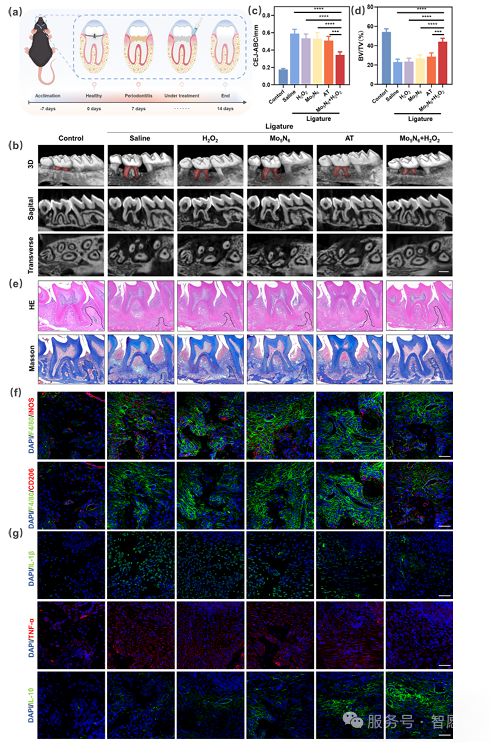抗菌与破生物膜:联合低浓度H₂O₂可高效杀灭牙龈卟啉单胞菌、具核梭杆菌等牙周致病菌,深度清除龈下生物膜,效果媲美临床3%H₂O₂且安全性更高;微环境重塑:抑制破骨细胞、减少牙槽骨吸收,促进巨噬细胞向抗炎M2型极化,下调促炎因子、上调抗炎因子;微生物组调控:恢复龈下菌群α/β多样性,减少致病菌丰度,富集双歧杆菌、唾液乳杆菌等有益菌,重建共生微生态;生物安全性:体外细胞毒性低、无溶血风险,体内主要器官无病理损伤,具备临床转化潜力。