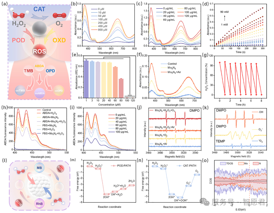 图 2. Mo₅N₆纳米酶的活性氧(ROS)生成性能。(a) 过氧化氢分解反应机理以及 3,3',5,5'- 四甲基联苯胺(TMB)、1,3 - 二苯基异苯并呋喃(ABDA)与邻苯二胺(OPD)氧化反应机理。不同 (b) 过氧化氢浓度与 (c) Mo₅N₆浓度下氧化型 TMB 的吸光度。(d) 不同 TMB 浓度下 Mo₅N₆类过氧化物酶(POD)活性在 652 nm 处随时间变化的吸光度曲线。(e) 加入不同浓度抗坏血酸(AA)后 652 nm 处的终点吸光度。(f) 不同反应条件下通过类过氧化物酶活性生成的氧化型 TMB 的紫外 - 可见吸收光谱。(g) 循环稳定性测试中过氧化氢消耗量的定量结果(催化循环定义为:在催化剂用量恒定的条件下,过氧化氢完成一次完整的氧化还原反应,每次反应后补加新鲜过氧化氢)。Mo₅N₆在连续 9 次循环后仍保留 96.1% 的催化活性。(h) 不同反应条件与 (i) 梯度浓度下 ABDA 的紫外 - 可见吸收光谱。(j) 可控催化条件下生成单线态氧(¹O₂)的电子顺磁共振(EPR)谱;以及采用不同自旋捕获剂检测 (k) 羟基自由基(・OH)、超氧阴离子自由基(O₂・⁻)与单线态氧(¹O₂)的电子顺磁共振谱:其中 5,5 - 二甲基 - 1 - 吡咯啉 - N - 氧化物(DMPO)用于检测・OH 与 O₂・⁻,2,2,6,6 - 四甲基哌啶(TEMP)用于检测 ¹O₂。(l) 亚甲基蓝(MB)与罗丹明 B(RhB)降解机理示意图。(m) 类过氧化物酶反应路径的自由能曲线,展示过氧化氢吸附、氧 - 氧键断裂及含OH 中间体的形成过程。(n) 类过氧化氢酶(CAT)反应路径的自由能曲线,显示过氧化氢通过OOH/*O₂中间体逐步歧化为氧气与水的过程。(o) Mo 的 d 轨道与 N 的 p 轨道的总态密度(TDOS)与分波态密度(PDOS),费米能级设为 0 eV(虚线)。数据显著性采用单因素方差分析计算。ns:无显著性差异,*p < 0.05,p < 0.01,*p < 0.001,p < 0.0001。