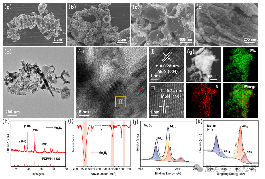 图1.五氮化六钼(Mo₅N₆)的合成与表征。(a–d) 五氮化六钼的扫描电子显微镜(SEM)图像,(e) 透射电子显微镜(TEM)图像,(f) 高分辨透射电子显微镜(HRTEM)图像以及(g)能谱分析(EDS)图像。(h)五氮化六钼的X射线衍射(XRD)图谱及其标准图谱。(i) 五氮化六钼的傅里叶变换红外光谱(FTIR)。(j)五氮化六钼的钼3d轨道X射线光电子能谱(XPS)与(k)氮1s轨道X射线光电子能谱。