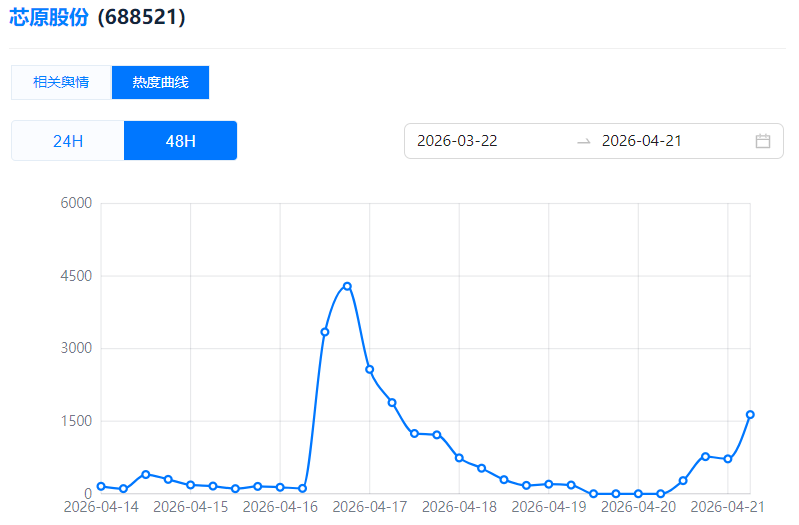 芯原股份:4月20日晚公告,2026年1月1日至4月20日,公司新签订单45.16亿元,继2025年连续三个季度创新高后继续保持强劲增长,为未来营收提供有力保障,热度上升21名。
