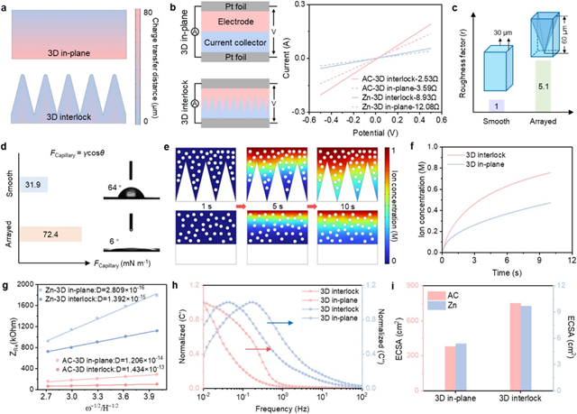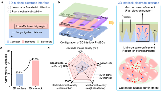 针对上述挑战,研究团队提出一种级联空间限域策略,构建了具有三维互锁结构的P-MSC,该策略将毛细力与电荷传输/存储行为耦合,实现了离子-电子的富集效果。通过在石墨箔集流体上激光刻蚀的金字塔形微阵列产生毛细力,将电极浆料和电解液限域在微沟槽内,构建致密的导电网络,并建立稳固的离子-电子相互作用界面,显著提升了离子的可及性和动力学性能。以锌//活性炭P-MSC为例,该策略将活性材料利用率提升了两倍以上,实现了117.5 mWh cm-3的优异能量密度和2382.0 mW cm-3的功率密度。该策略在多种P-MSC体系中展现出可靠的普适性。