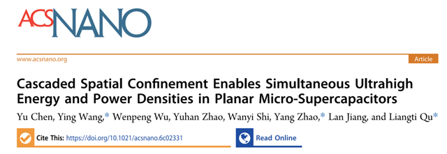 近日,北京理工大学化学与化工学院赵扬教授联合清华大学曲良体教授、王赢博士团队在国际顶级化学期刊《ACS Nano》上发表题目为“Cascaded Spatial Confinement Enables Simultaneous Ultrahigh Energy and Power Densities in Planar Micro-Supercapacitors”的研究论文(DOI: 10.1021/acsnano.6c02331)。北京理工大学为第一通讯单位,北京理工大学赵扬教授、清华大学曲良体教授、王赢博士为本论文的共同通讯作者,北京理工大学姜澜院士为本研究的合作者,化学与化工学院23级硕士研究生陈瑜为论文第一作者。本研究得到了国家重点研发计划、国家自然科学基金、京津冀基础研究合作专项等项目支持。