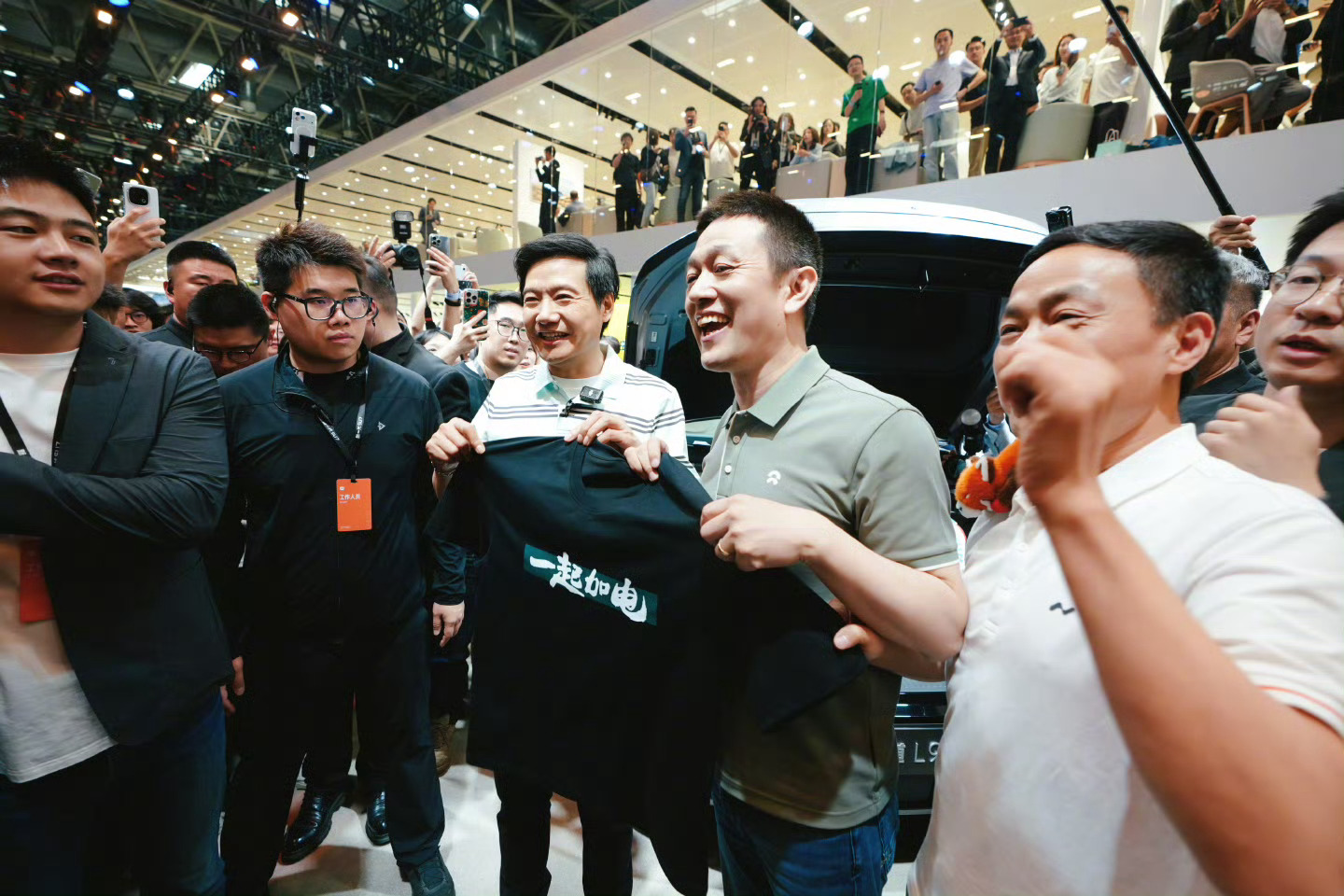 4月24日,2026年北京车展今日迎来媒体日,小米创始人雷军现身车展现场,他亲自向理想汽车、小鹏汽车、蔚来、比亚迪赠送定制T恤的举动引发热议。雷军为多家中国新能源汽车品牌准备了带有不同标语的专属T恤,通过简短语句对应各家企业及创始人的公众标签。