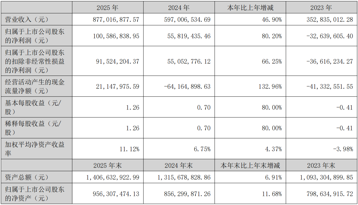 湖北东田微科技股份有限公司(证券代码:301183,证券简称:东田微)4月26日发布2025年年度报告。报告显示,公司全年实现营业收入8.77亿元,同比增长46.90%;归属于上市公司股东的净利润为1.01亿元,较上年同期的5581.94万元大幅增长80.20%,经营业绩显著提升。