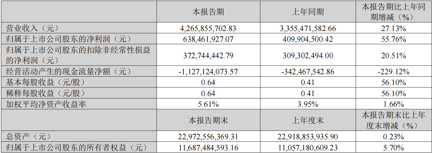 报告期内,公司实现归属于上市公司股东的扣除非经常性损益的净利润3.73亿元,同比增长20.51%。公司加权平均净资产收益率为5.61%,较上年同期的3.95%提升1.66个百分点。基本每股收益为0.64元,同比增长56.10%。以披露前一交易日总股本10.06亿股计算,全面摊薄每股收益为0.6350元。