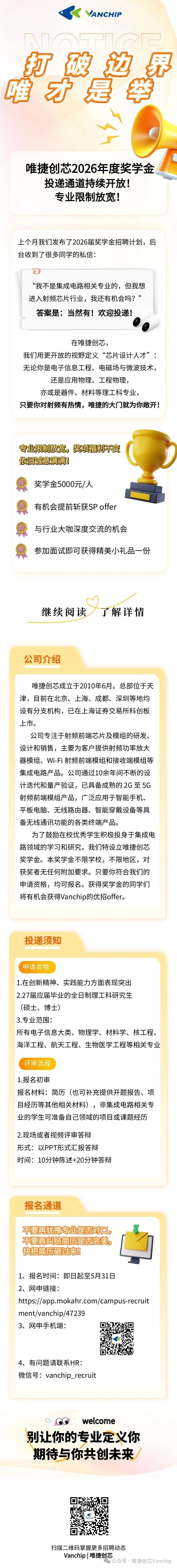 奖学金|唯捷创芯2026年度奖学金项目持续进行中 作者: 爱集微 2小时前 相关舆情 AI解读 生成海报 来源:唯捷创芯 #唯捷创芯# #奖学金# 评论 收藏 点赞 1215 责编: 爱集微 来源:唯捷创芯 #唯捷创芯# #奖学金# 收藏 点赞 分享至: 微信扫一扫分享 THE END 相关推荐 唯捷创芯诚邀您共赴2026北京车展 如何观察唯捷创芯战略投资优智联?UWB的技术协同与产业破局 唯捷创芯620,176股股权激励限售股3月27日上市流通 唯捷创芯2025年营业总收入增10.36%,扭亏为盈引关注 唯捷创芯:2025多维突破筑壁垒 2026锚定AI与汽车电子新增长点 唯捷创芯2025年业绩预增 +关注 爱集微 微信: 邮箱:laoyaoba@gmail.com 13.1w文章总数 12012.5w总浏览量 最近发布 2026北京车展加码汽车智能化,高通宣布多项新合作 1小时前 高通携生态伙伴亮相2026北京车展 1小时前 奇瑞与高通拓展合作,共同打造新一代智能汽车体验 2小时前 奖学金|唯捷创芯2026年度奖学金项目持续进行中 2小时前 领开半导体完成新一轮融资,聚焦AI推理存储新赛道,加速国产HBF芯片新突破 2小时前 获取更多内容 最新资讯 富信科技2025年实现营收5.35亿元,净利润同比下降11.41% 27分钟前 润健股份2025年实现营收103.49亿元,净利润同比下降84.62% 53分钟前 泰福泵业2025年实现营收9.35亿元,净利润同比增长46.87% 55分钟前 2026北京车展加码汽车智能化,高通宣布多项新合作 1小时前 清溢光电2025年实现营收12.4亿元,净利润同比增长8.89% 1小时前 雅化集团2025年实现营收85.43亿元,净利润同比增长145.95% 1小时前