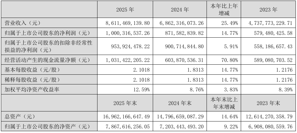4月28日,江苏雅克科技股份有限公司正式发布2025年年度报告。年报显示,2025年雅克科技实现营业总收入86.11亿元,同比增长25.49%;归属于上市公司股东的净利润10亿元,同比增长14.77%;归属于上市公司股东的扣除非经常性损益的净利润9.54亿元,同比增长5.91%;经营活动产生的现金流量净额10.31亿元,同比增长70.8%。