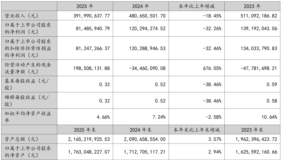 4月27日,广东新劲刚科技股份有限公司正式发布2025年年度报告。年报显示,2025年新劲刚实现营业总收入3.92亿元,同比下降18.45%;归属于上市公司股东的净利润8148.59万元,同比下降32.26%;归属于上市公司股东的扣除非经常性损益的净利润8124.73万元,同比下降32.46%;经营活动产生的现金流量净额1.99亿元,同比增长676.05%。