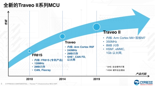 Traveo II是赛普拉斯车用MCU的最新产品,追溯起来,该系列的源头是2010年推出的FR81S(专有内核),工作频率为128MHz。在2014年,上一代产品Traveo I发布,采用了ARM Cortex R5F内核,工作频率为240MHz,获得了不错的市场反响。