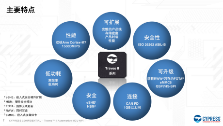 全新的Traveo II在内核上进行了升级,采用Cortex M4-双核M7,工作频率提升到350MHz,闪存更是大幅增加,由2MB上升到8MB,支持接口从安全硬件扩展(SHE)升级到硬件安全模块(HSM)。值得强调的是,相对于SHE,HSM是加密程度更高的机制,有独立的M0内核来处理加密单元。