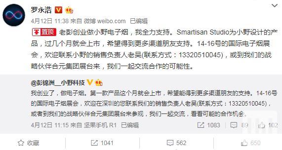 “老彭创业做小野电子烟,我全力支持。Smartisan Studio为小野设计的产品,过几个月就会上市,希望得到更多渠道朋友支持。14-16号的国际电子烟展会,欢迎联系小野的销售负责人老吴,或到我们的战略伙伴合元集团展台来,我们一起交流合作的可能性。”