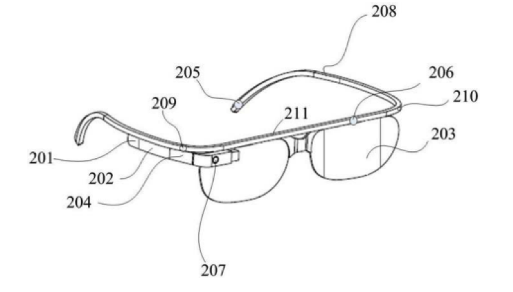 OPPO广东移动通信有限公司在2018年8月公开的一件专利(公开号CN 109059929)中公开了一种可戴式设备的导航方法。本申请中的可穿戴设备是指---智能眼镜,如下图2所示。