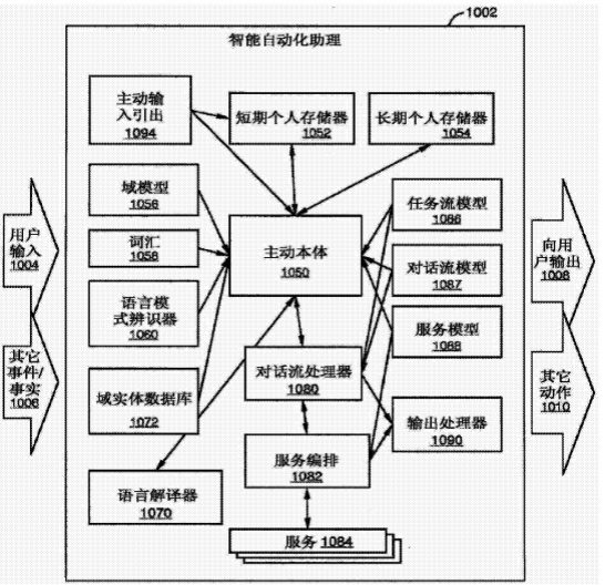 图1所示,专利中揭晓了一种用于操作自动化助理的方法,其包括:从自用户接收的语音输入1004获得文本字符串;解译所述所接收的文本字符串以得到用户意图的表示,所述解译至少部分地基于永久的长期个人存储器1052和短期个人存储器1054,其中所述永久的长期个人存储器1052包括与所述用户相关联的多个字,以及其中所述短期个人存储器1054包括与所述自动化助理的当前用户会话相关的数据;至少部分地基于用户意图的所述表示而识别任务以及用于所述任务的至少一个参数;执行所述所识别的任务;以及将输出提供给所述用户1008,其中所述输出10008与所述任务的所述执行有关。