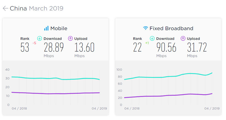5月4日,第三方测速机构speedtest给出最新统计数据显示,目前中国国内4G网速依然在持续上涨,其平均下载速度达到了28.89Mbps(3.61MB/s),远远高出26.12Mbps(3.27MB/s)全球平均值。
