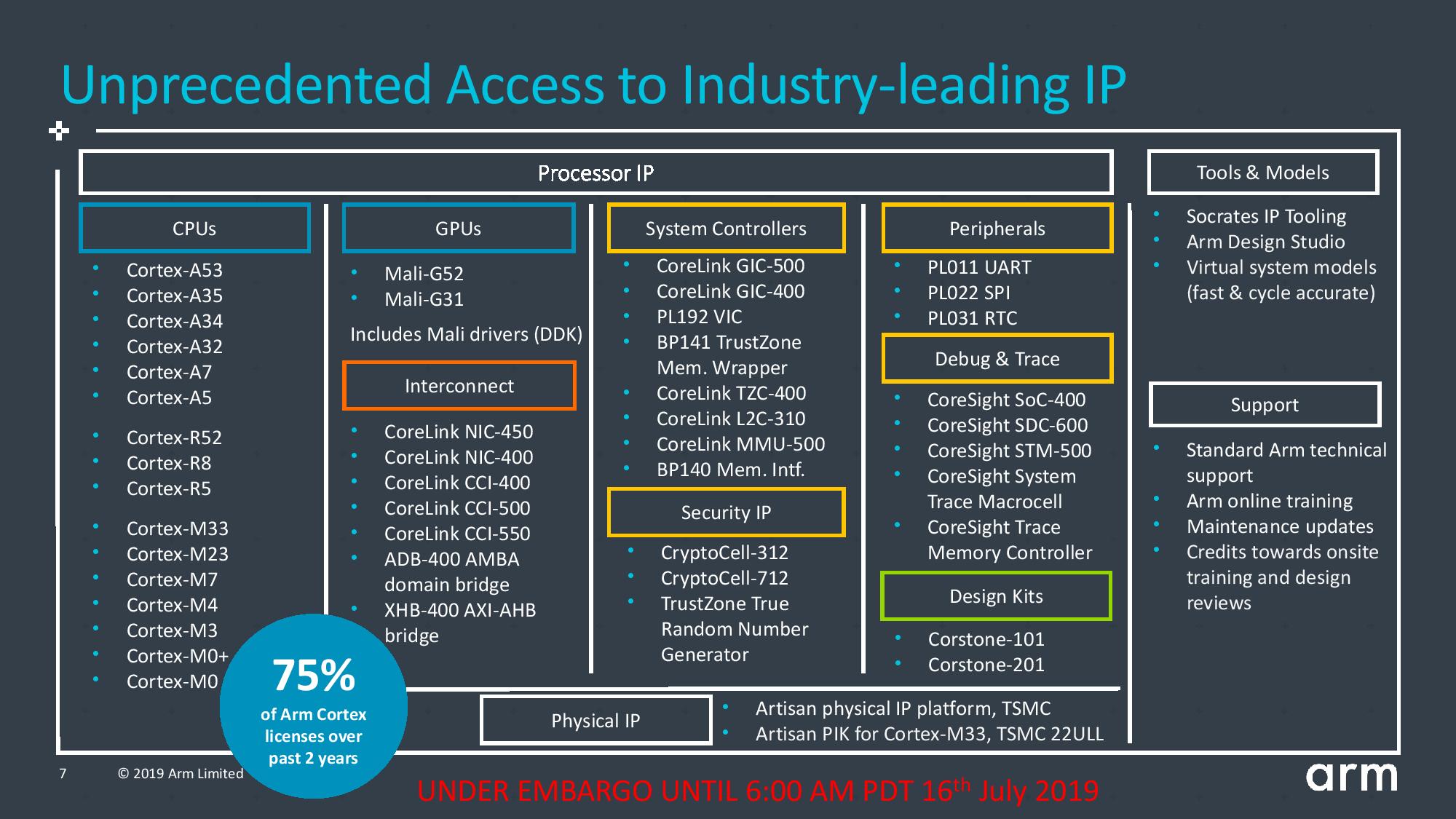 目前,灵活接入开放的IP涵盖了ARM绝大多数Cortex-A/-R/-M CPU核、Mali GPU、系统IP和工具等,比如Cortex A53、Mali G52等,但高端的产品则暂时被排除在外,比如A75、A76、G72等。