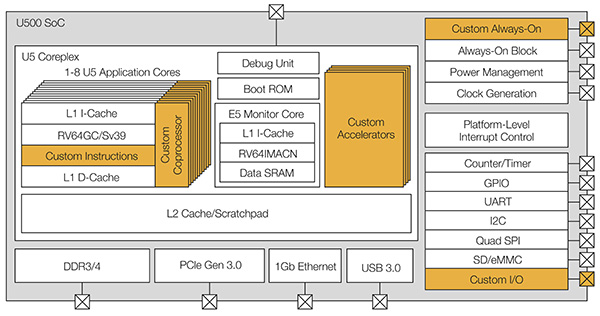 该公司的Freedom平台包括完整的软体规格、用于开发作业系统的板级支援包(BSP)、开发板和基础晶片等,允许客户创建自己的晶片增强型设计和客制化产品。Freedom U500家族是一款完全支援Linux的嵌入式应用处理器,采用多核RISC-V CPU,运作速度为1.6GHz甚至更高,支援加速器和快取记忆体一致性,适于机器学习、储存和网路等应用。它支援标准的高速周边设备,包括PCIe 3.0、USB 3.0、Gb乙太网路和DDR3/DDR4。