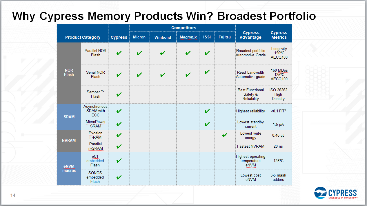 根据赛普拉斯存储事业部中国区市场经理曹敏的介绍,赛普拉斯在1982年成立的时候,就是以存储芯片供应商而出现的。在与Spansion合并以后,赛普拉斯能够提供全面的存储解决方案,涵盖了NOR Flash、SRAM、NVRAM、eNVM等产品线。而且,赛普拉斯的存储器解决方案在很多领域都名类前茅,如在汽车存储器领域,以65%的市占率雄冠市场,在医疗领域也是第一,工业领域超过了60%,通讯领域也超过了50%。